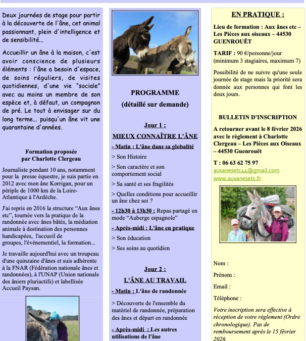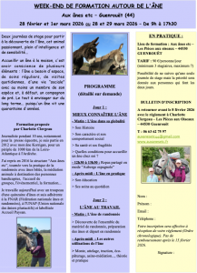 19 janvier 2026Fin février et fin mars, la ferme proposera à nouveau deux week-ends de stage pour partir à la découverte de l’âne, cet animal passionnant, plein d’intelligence et de sensibilité…